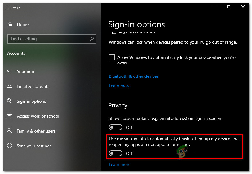 Accessing the Sign-in Options menu - Once you’re inside the Sign-in options tab, move over to the right-hand pane and scroll down to the Privacy section. When you get there, make sure that the toggle associated with ‘Use my sign-in info to automatically finish setting up my device and reopen my apps after an update or restart’ is turned OFF.