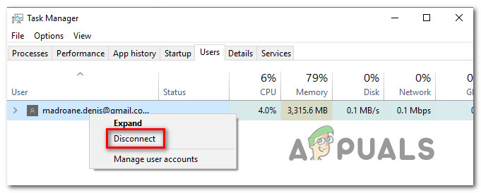 - The previous user is still connected – Another possibility is that the previous user that used this PC hasn’t completed the logoff procedure. This can happen due to a machine interruption or due to user preference. To fix this issue in this case, you’ll need to use Task Manager to disconnect the previous user.