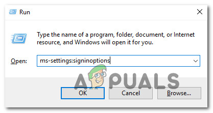- Press Windows key + R to open up a Run dialog box. Next, type “ms-settings:signinoptions” inside the text box and press Enter to open up the Sign-in Options section of the Accounts tab (inside the Windows 10 Settings App).