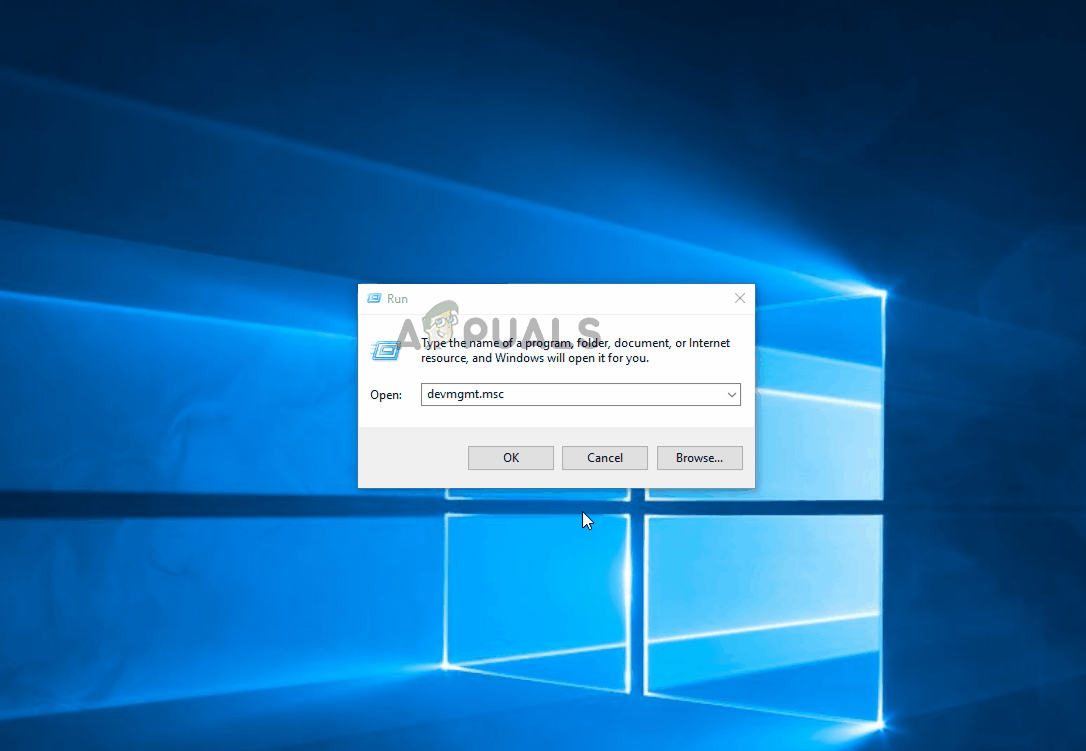 - Press Windows key + R to open up a Run dialog box. Then, type “devmgmt.msc” and press Enter to open up Device Manager.