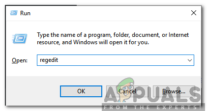 - Press Windows key + R to open up a Run dialog box. Then, type “regedit” inside the text box and press Enter to open up Registry Editor. When you’re prompted by the UAC (User Account Control), click Yes to grant administrative privileges.