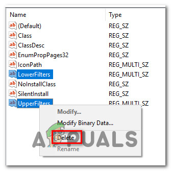 Exporting the key for backup purposes - Once the backup is in place, select the {4D36E965-E325-11CE-BFC1-08002BE10318} key, then move over to the right-hand pane. Once you get there, select both Upperfilters and Lowerfilters by holding the Ctrl key, then right-click on one of them and choose Delete from the context menu to get rid of them.