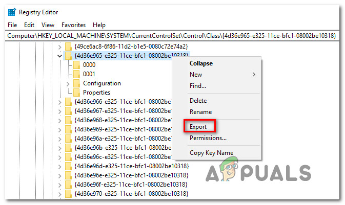 - Once you get to the correct location, let’s start things up by creating a backup, just in case you encounter any unexpected issues down the line. To do this, right click on the {4D36E965-E325-11CE-BFC1-08002BE10318} entry and choose Export. Then, select a convenable location to save the backup file and name it accordingly so you remember why you created it in the first place. Finally, hit Save to create the backup file.