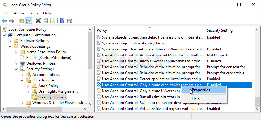 - Double click on the “User Account Control: Only elevate executables that are signed and validated” policy option, check the box next to the “Disabled” option, and apply the changes you have made before exiting Group Policy Editor.