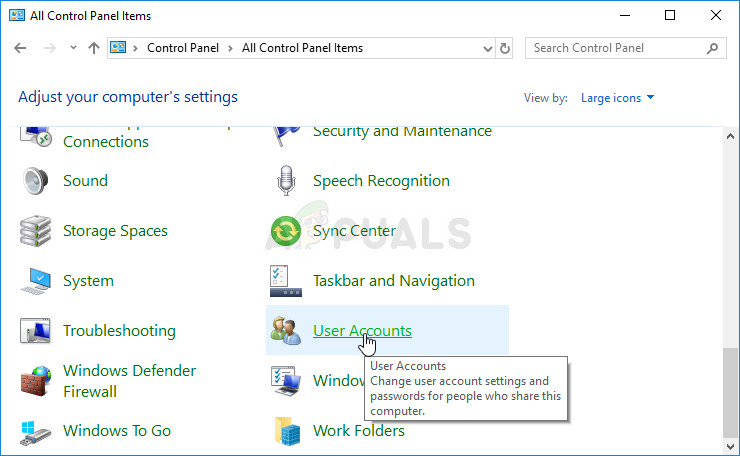 - Switch the View by option in Control Panel to Large Icons and locate the User Accounts option.