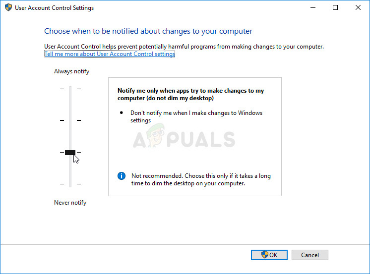 - You will notice that there are several different options you can choose on the slider. If your slider is set at the top level, you will definitely receive more of these pop-up messages than usual without removing the error. Also, the error messages similar to the one you are experiencing right now are usually caused by User Account Control.