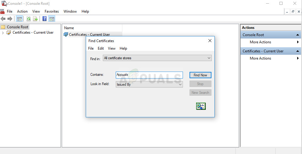 - After that, click on Certificates at the pane under the Available snap-ins text, click on Add and click OK at the bottom of the window. Right-click on Certificated from the main MMC window and choose Find Certificates.
