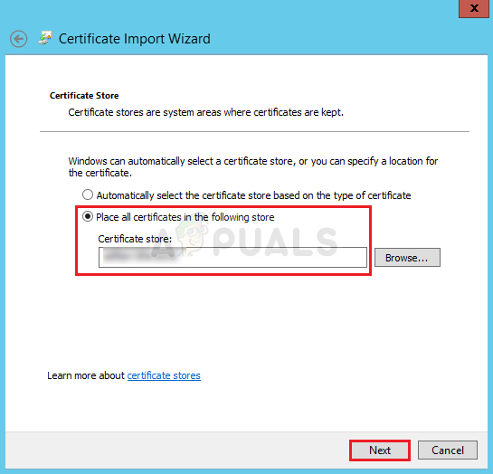 - Make sure you don’t choose the “Automatically select the certificate store” option as it rarely works. Instead, choose the “Place all certificates in the following store” radio button and then click Browse. Make sure you write down the certificate’s name as you will need it later.