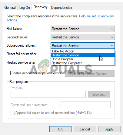 - After that, navigate to the Recovery tab inside the service’s Properties. You should see three options at the top of the window: First failure, Second failure, and Subsequent failures.