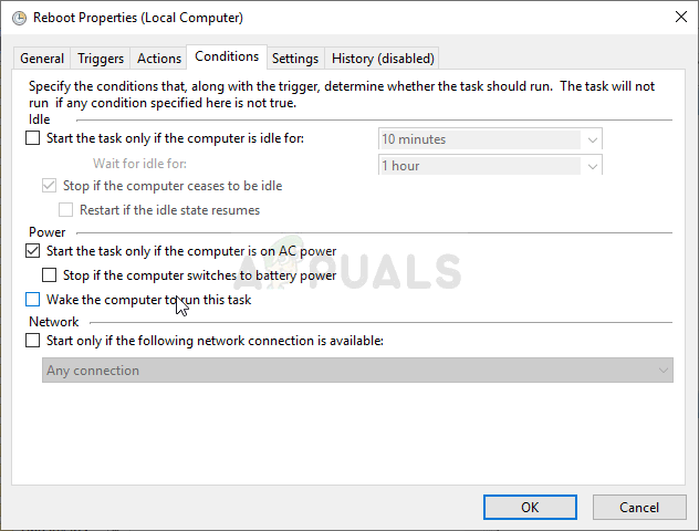 - In the properties window, navigate to the Conditions Check under the Power section for the Wake the computer to run this task entry. Make sure the checkbox next to this option is unchecked!