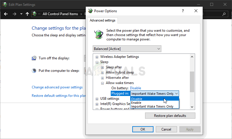 - In this window, click the small plus button next to the Sleep entry on the list to expand it. Inside, click to expand the Allow wake timers Click to choose the Disable option for both On battery and Plugged in scenarios before clicking the OK button to apply the changes.