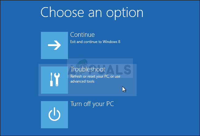 - Click on the Troubleshoot entry located just under the Continue button in the Choose an option.