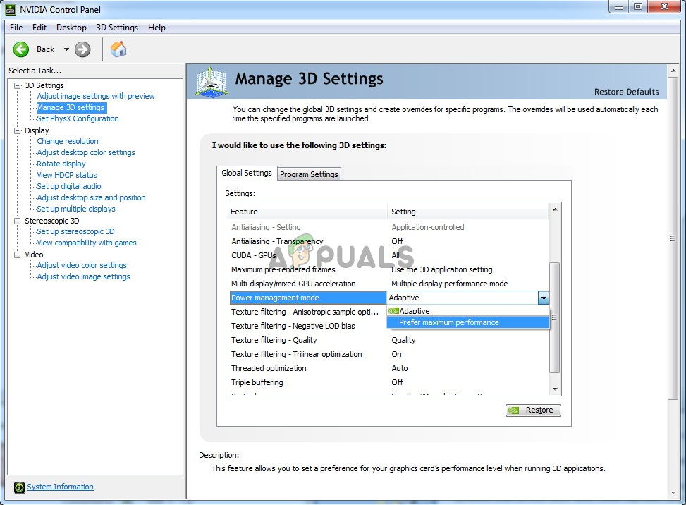 - Scroll down the list of available settings until you reach the Power management mode Click the downward-facing arrow and choose the Prefer maximum performance option from the menu which will appear.