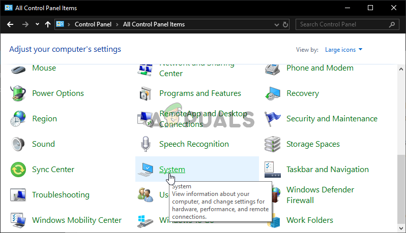 - Inside Control Panel, change the View by option to Large or Small icons and scroll down until you reach the System Left-click to open it.