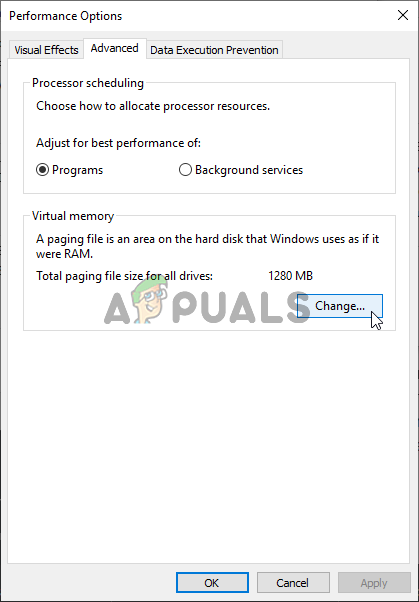 - Inside the Advanced tab of System Properties, click the Settings button under the Performance Navigate to the Advanced tab of the Performance Options window and click the Change button under Virtual memory.