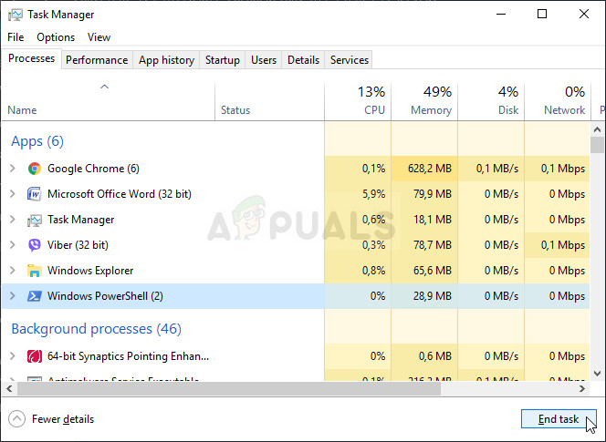 - Click on More details at the bottom left part of the window to expand Task Manager and search for the Windows PowerShell It should be located right under Apps. Select it and choose the End task option from the lower right part of the window.
