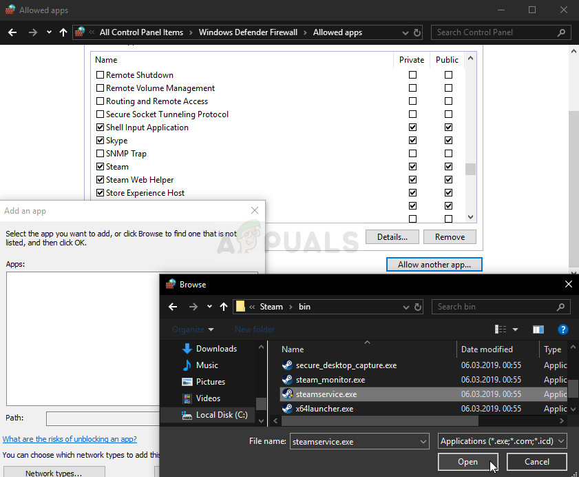 - Click on Windows Defender Firewall and click on the Allow an app or feature through Windows Firewall option from the left side list of options. A list of installed apps should open. Check the bottom of the window for the Allow another app button. Under the Path section, select Browse. Navigate to where you installed Steam (C:\Program Files (x86)\Steam by default), open the bin folder, and choose the SteamService.exe file.