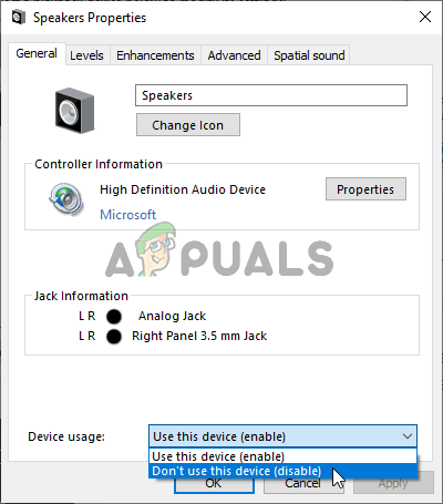 - Stay in the General tab and choose Don’t use this device (disable) next to the Device usage option before clicking OK. Check to see if Dying Light still crashes on your computer!