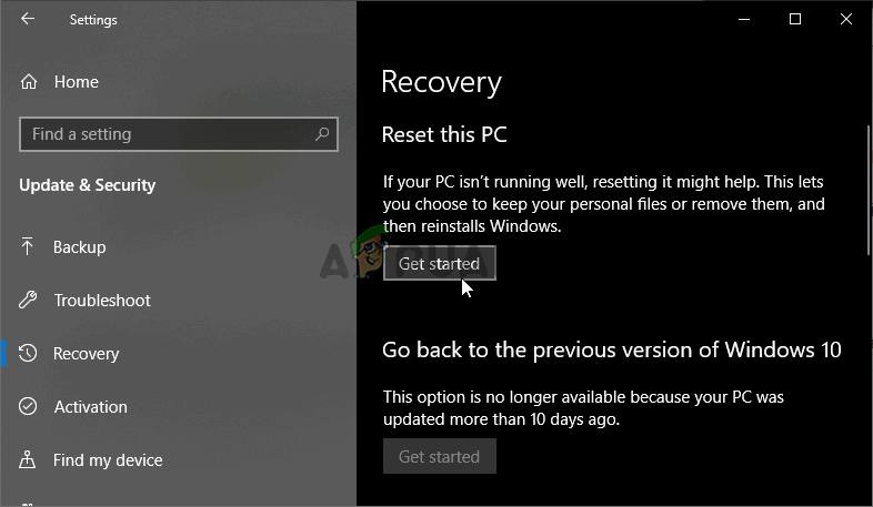 - In the Recovery tab, check the Reset this PC section and click the Get started button in order to begin the resetting process.