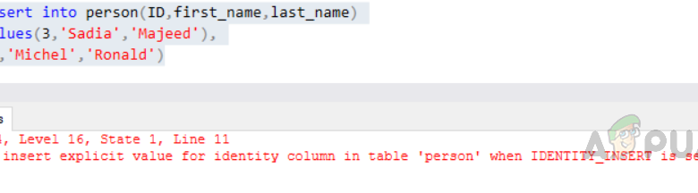 If you attempt to insert data with the IDENTITY_INSERT set to OFF, including a value for the identity column in the INSERT statement will trigger the error: “Cannot insert explicit value for identity column in table ‘person’ when IDENTITY_INSERT is set to OFF.”
