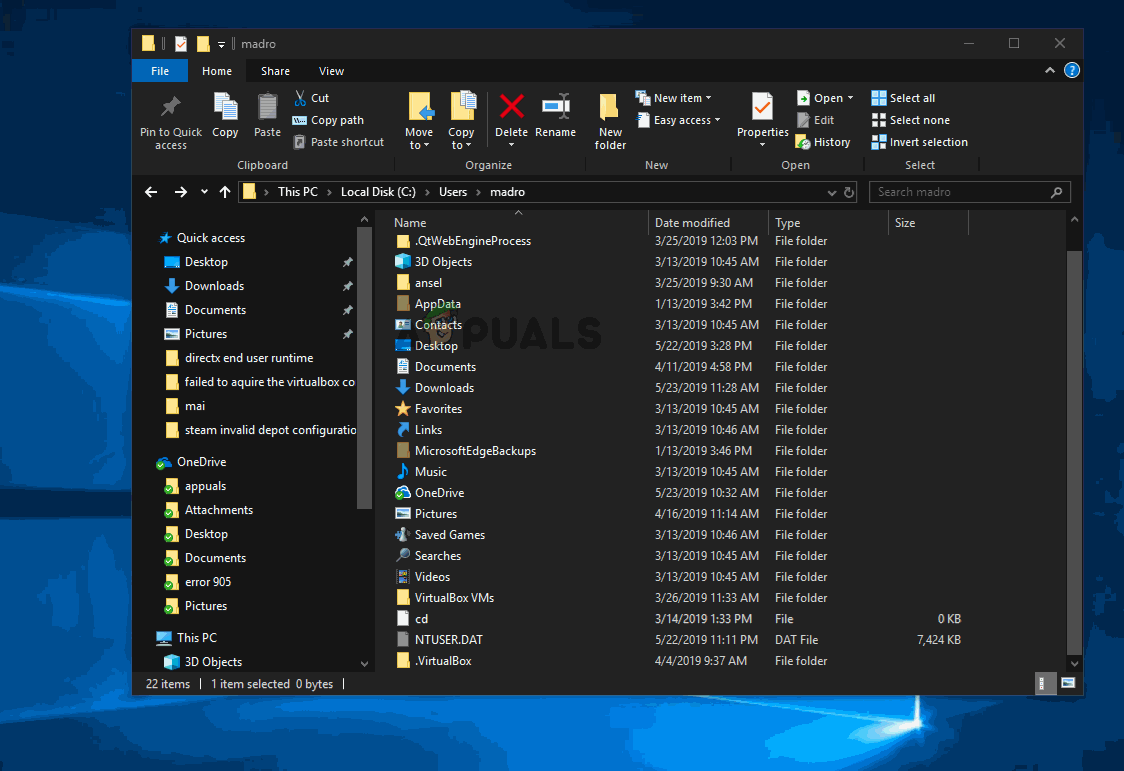 - Once you get to this location, right-click on .VirtualBox and choose Cut from the context menu. Additionally, you can press Ctrl + X to cut the file directly.