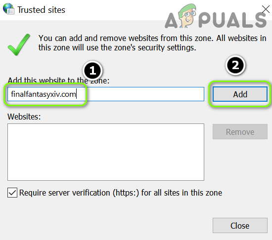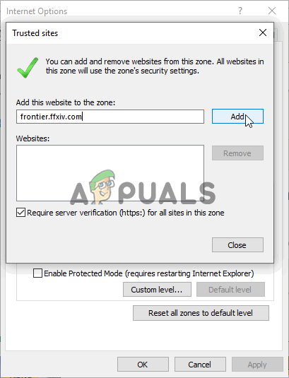 Add Final Fantasy XIV to Trusted Sites - Now click on the Add button and then close the Window.
