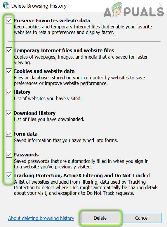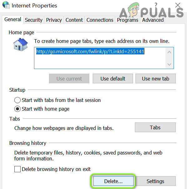 - Launch the Internet Options (as discussed above) and in the General tab, click Delete (in the Browsing History section).