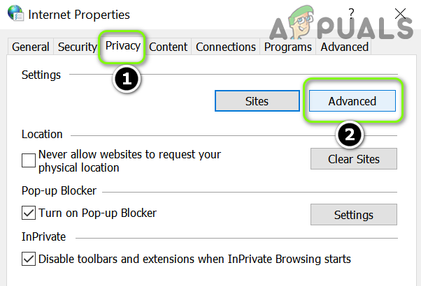 Delete the Browser History in the Internet Options - Then steer to the Privacy tab and in Settings, click on Advanced.