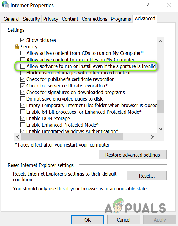 Enable Allow software to run or install even if the signature is invalid - Now checkmark the option of Allow software to run or install even if the signature is invalid and then make sure all the SSL/TLS options (except 3.0) are check-marked.