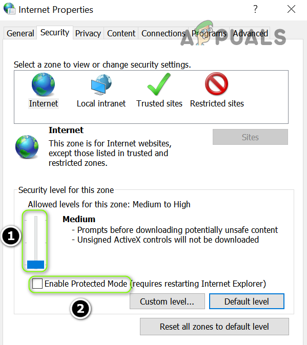 - Now lower the bar of Security Level of This Zone to as minimum as possible (usually, Medium) and then uncheck the option of Enable Protected Mode.
