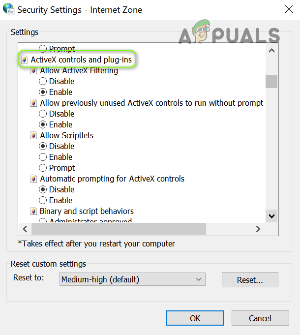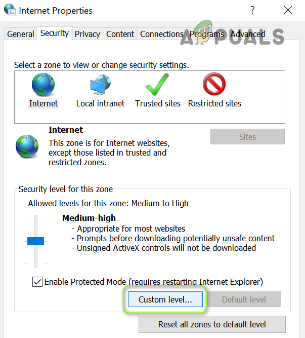 Open Custom Level in the Security Tab of the Internet Options - Now make sure that all the options related to ActiveX are enabled and then check if the FFXIV Launcher is working normally.