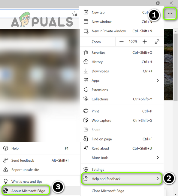Open Microsoft Edge - Now click on three horizontal ellipses (near the top left) to open the Edge menu and hover your mouse over Help and Feedback.