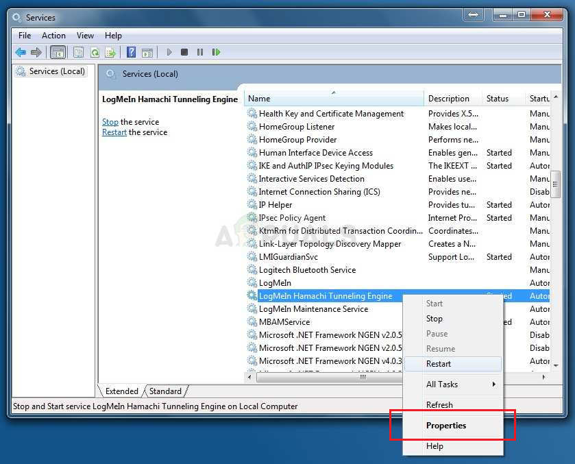 2. Restart the LogMeIn Hamachi Tunneling Engine Service