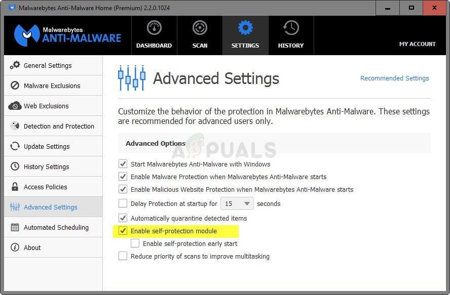 - Open MBAM >> My Account and click on Deactivate. Navigate to Settings >> Advanced Settings and uncheck the box next to the “Enable self-protection module” option.