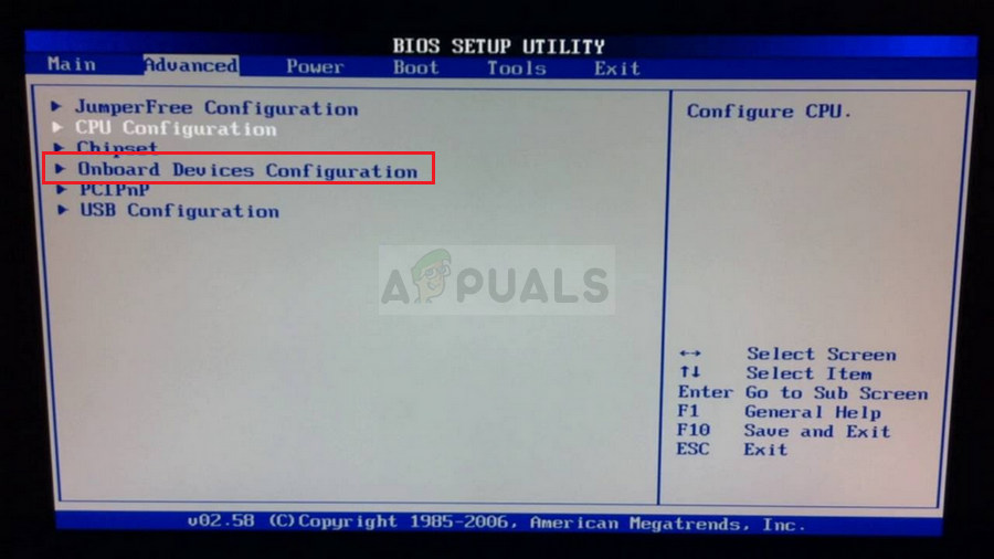 - Use the arrow keys to navigate to the Advanced tab or a similar sounding tab inside BIOS. Inside, select an option named Onboard, Device Configuration, Integrated Peripherals or something similar inside.