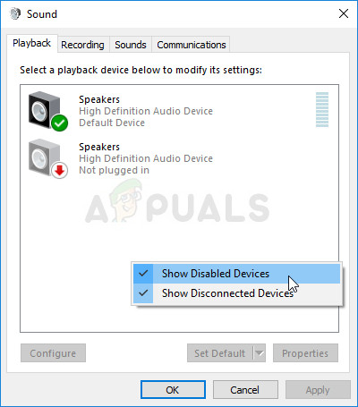 - You should now be able to see the playback device you want to set as default. If that is not the case, right-click anywhere in the middle of the window and check the boxes next to the Show Disabled Devices and Show Disconnected Devices Your device should now appear.