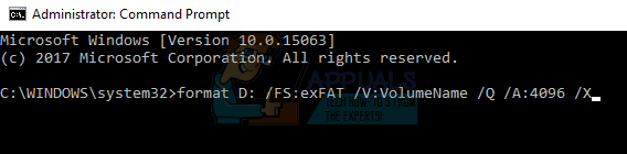 format D: /FS:exFAT /V:VolumeName /Q /A:4096 /X