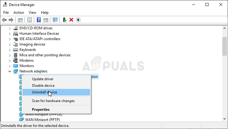 - Right-click on the TAP Adapter you want to uninstall and select “Uninstall device“. This will remove the adapter from the list and uninstall the networking device. Click “OK” when prompted to uninstall the device.