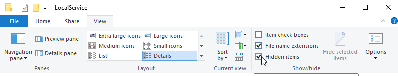 - If the AppData folder is not visible, enable the viewing of hidden files and folders. In File Explorer, click the View tab and select the Hidden items checkbox within the Show/hide section. File Explorer will then display hidden files.