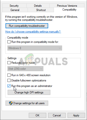 - Locate the main executable inside, right-click its entry, and choose Properties from the context menu which will appear. Once inside, make sure you navigate to the Compatibility In the Settings section, check the box next to the Run this program as an administrator option.