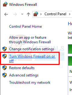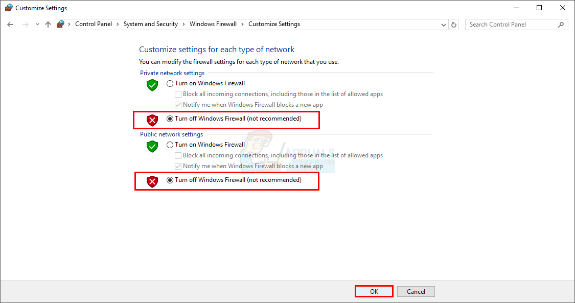 - Click Turn off Windows firewall (not recommended) in both private and public network settings