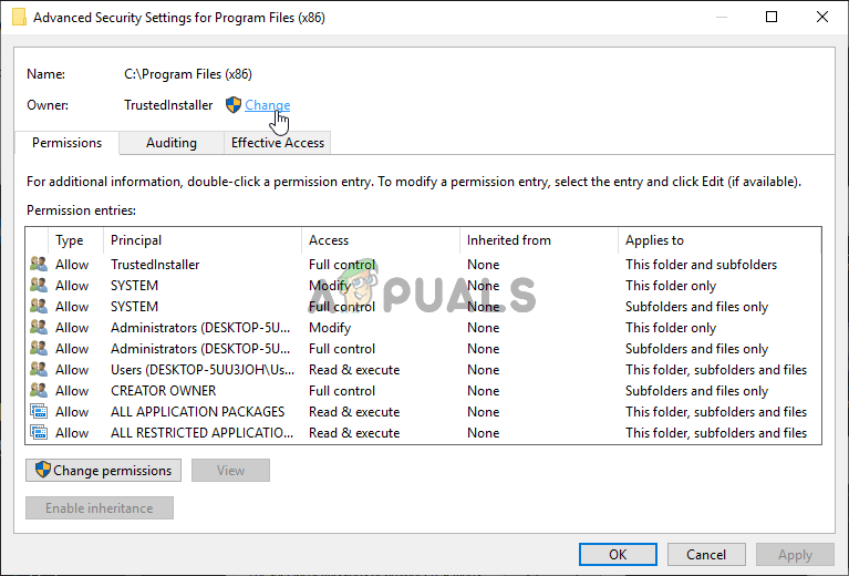 - Click the Advanced button at the bottom and click the blue link titled Change next to the ownership entry in the Advanced Security Settings window which will appear on the screen.