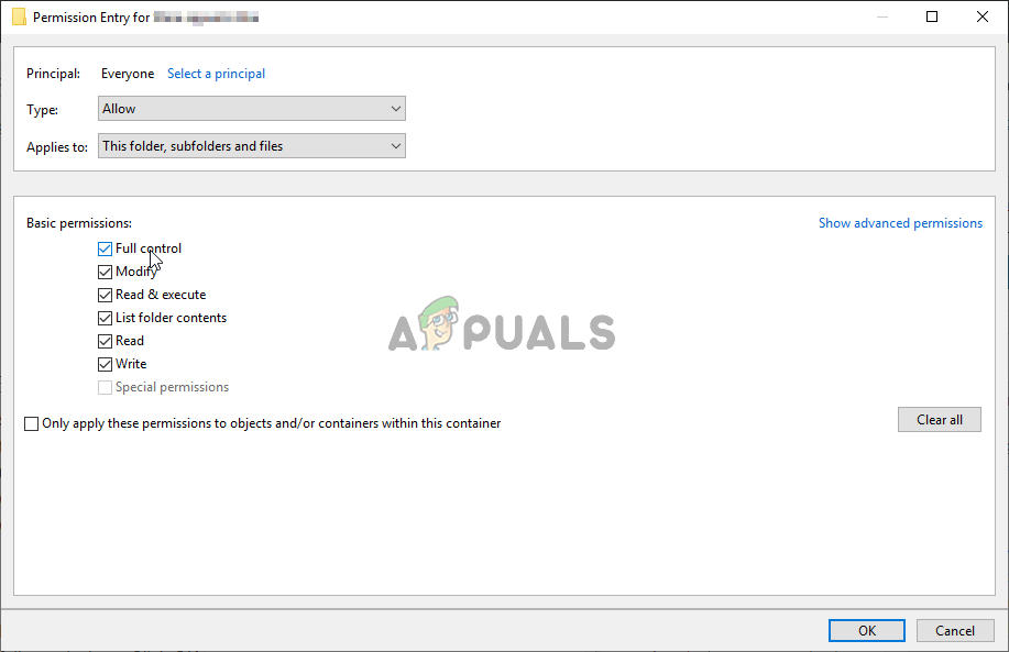 - In the Basic permissions window, check the box next to the Full control Click the OK button to add full permissions. Click OK two more times to close all windows which will appear and restart your computer to see whether the “Set user settings to driver failed” error still appears!