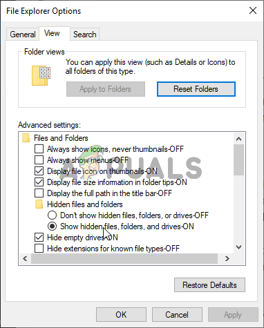 - Click the Start menu button and search for ‘File Explorer Options’. Click the first option which will appear as a result to open it. Navigate to the View tab and switch the radio button under the Hidden files and folders option to Show hidden files, folders, and drives. Click the OK button to apply the changes.