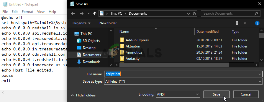 - Use the Ctrl + S key combination to save the file. In the ‘Filename’ section simply type ‘script.bat’ but make sure the Save as type option is set to All files. Save it anywhere on your computer.