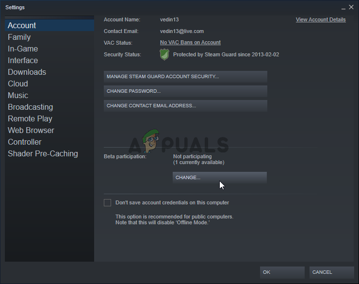 - Click the Steam option from the menu at the top of the client’s screen and choose Settings. In the Settings window make sure you stay in the Account tab and click the Change button under the Beta participation