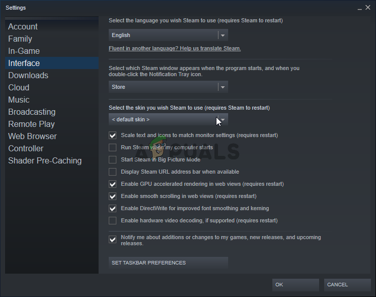 - Click the Steam option from the menu at the top of the client’s screen and choose Settings. In the Settings window make sure you navigate to the Interface tab and check the Select the skin you wish Steam to use (requires Steam to restart) option at the top of the window.