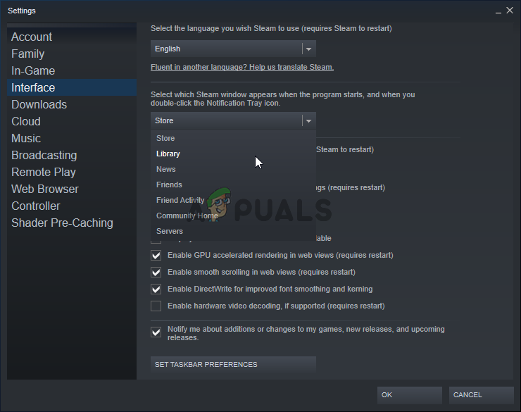 - Click the Steam option from the menu at the top of the client’s screen and choose Settings. In the Settings window make sure you navigate to the Interface tab and check the Select which Steam window appears when the program starts, and when you double-click the Notification Tray icon option at the top of the window.