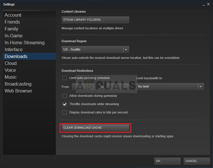 - Click the Steam option from the menu at the top of the client’s screen and choose Settings. In the Settings window, navigate to the Downloads tab and check the bottom of the window for the Clear Download Cache button.