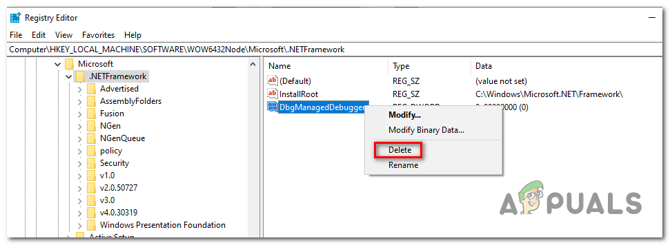 - When you arrive at the correct location, right-click on DbgManagedDebugger in the right-hand section and select Delete from the context menu.